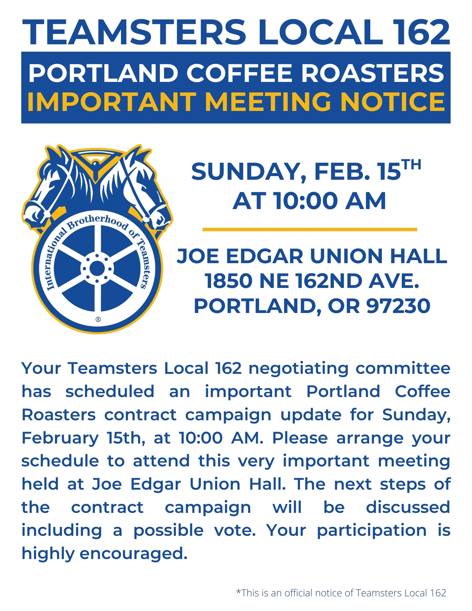 The Teamsters Local 162 January General Membership Meeting will be held on Sunday, February 1st, at 10:00 AM PT / 11:00 AM MT, at Joe Edgar Union Hall in Portland, OR. For members who are 75+ miles away from the Local, you may join via zoom to hear reports of Officers. |